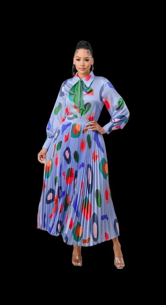 This beautiful Satin Bow Skirt set is timeless. The blouse come with a neck tie that is removable.