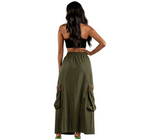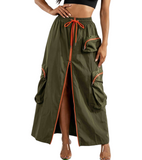 Cargo inspired detail add an utilitarian and trendy elemt to this skirt. Drawstring waist provides adjustable comfort and a customized fit.
