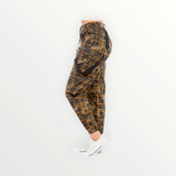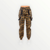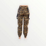 High waist grid Camo print jogger pants with attached suspenders. Slim fitted elastic banded hem.