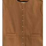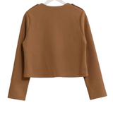 The Jacket is single breasted button front bodice a chic round neck. It has long sleeve stylish epauletts with welt pockets.